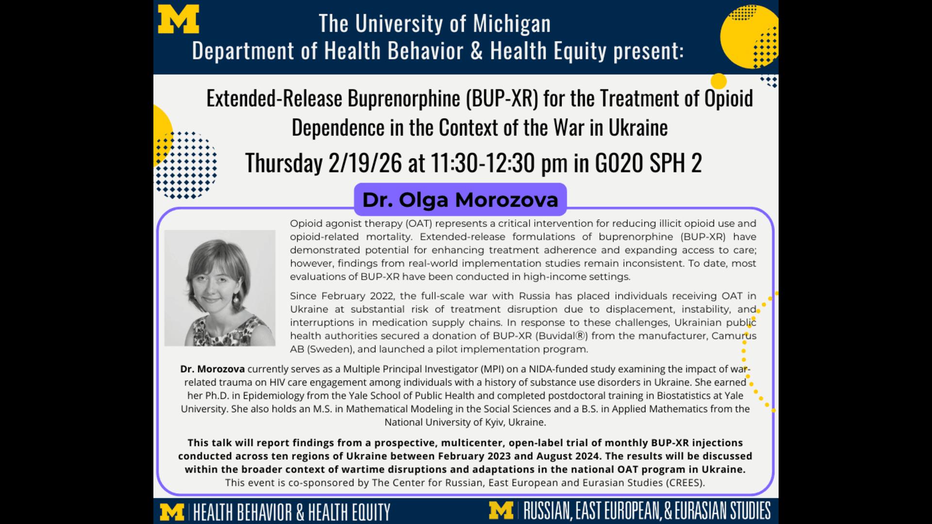 Feb 19Extended-Release Buprenorphine (BUP-XR) for the Treatment of Opioid Dependence in the Context of the War in Ukraine This talk will report findings from a prospective, multicenter, open-label trial of monthly BUP-XR injections conducted across ten regions of Ukraine between February 2023 and August 2024.